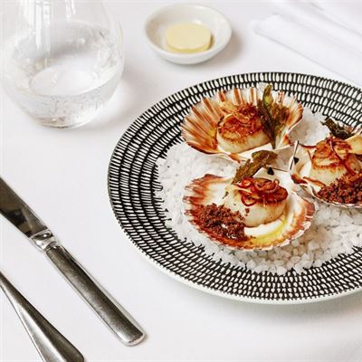 Dive right in with grilled King prawns, lemon, chilli and garlic butter, baby cos, fennel and cucumber; then cast out a line to hook a main of crispy skin barramundi fillet with smoked garlic potato, gai lan, anchovy, soybeans, caper and lemon butter.