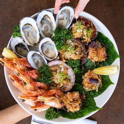 Pair a chilled glass of Riesling with a seafood platter of chilled prawns, Moreton Bay bugs, oysters, battered mackerel, crispy fried squid, lobster pot and chilled mayo, mixed leaf salad, rustic fries and dipping sauce.