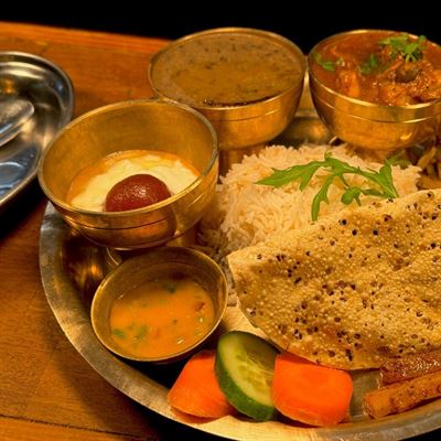 Large windows invite natural light by day, while the evening glow transforms the space into a cosy retreat. Settle in with a signature Mountain Thunder smoothie to go with a goat thali set with rice, lentil soup, saag, goat curry, pickles, dessert, papad, pure ghee and salad; or delve into dharana chicken thukpa with noodles, carrot, cabbage, ginger, garlic chilli, boiled eggs, herbs and alu chop.