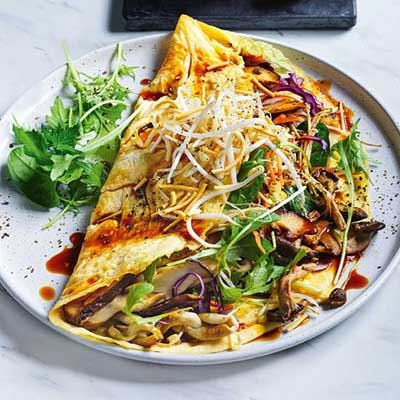 Meanwhile, place the snow peas in a large heatproof bowl and cover with boiling water. Set aside for 2 minutes or until tender. Refresh under cold water. Drain well.