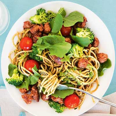 Place bottom buns on a plate, add one heaped tablespoon of tomato relish, followed by a little handful of spinach.