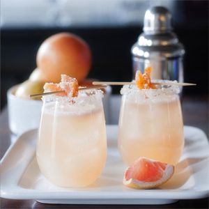 Top with grapefruit soda and strain into a glass rimmed with salt.