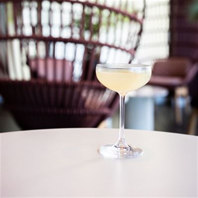 Dip a chilled coupe or martini glass into a light amount of caramel sauce and then a light amount of sea salt. Stir and strain into dressed coupe glass.??