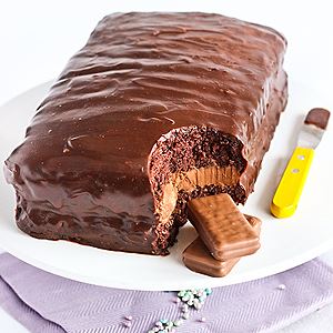 Use a serrated knife to trim the top of each cake. Halve cakes horizontally. Spread cut sides with a little orange icing and sandwich together. Place 20 cm cake on a serving plate. Spread top and sides with orange icing. Use a serrated knife to cut the top of the 15 cm cake on an angle, then place on top of the 20 cm cake.